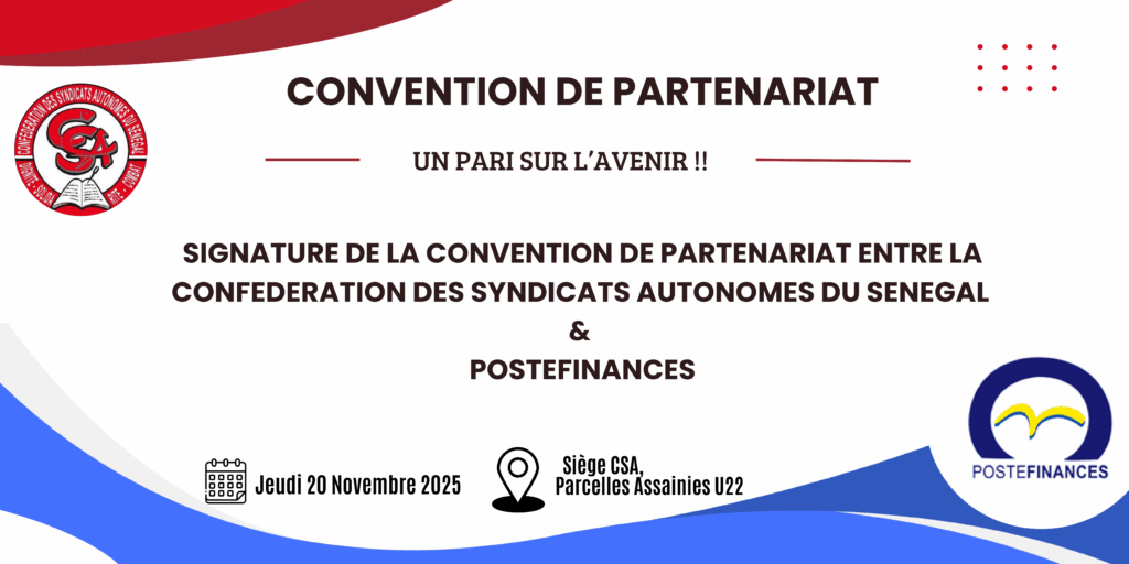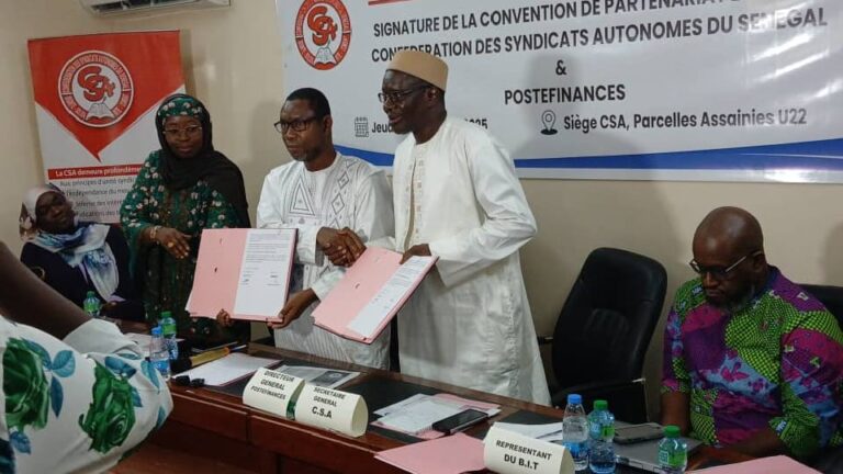 La Confédération des Syndicats Autonomes du Sénégal (CSA) et POSTEFINANCES ont noué, le jeudi 20 novembre 2025, un partenariat stratégique visant à transformer les conditions socio-économiques des travailleurs sénégalais.